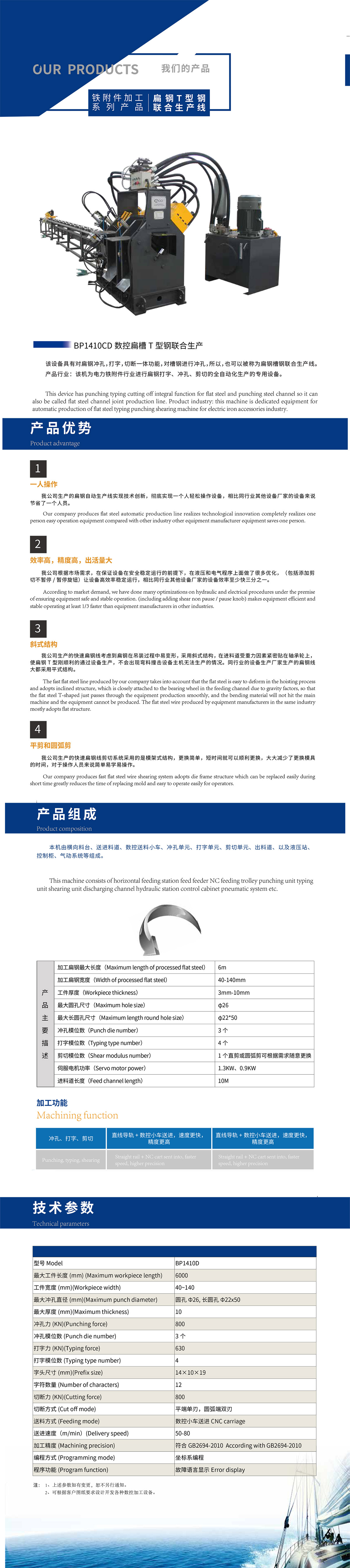 公司主要產品有:數控扁鋼、角鋼、槽鋼沖剪打印聯合生產線;拉線棒全自動成型焊接設備;抱箍自動上料成型機;數控液壓連接板沖孔機;數控高效平面鉆等專業化自動化設備。